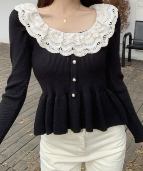 ◆DETAIL◇繊細なレースとパールボタンのディテールが華やかさを引き立てる、フェミニンなリブニット。体に沿うスリムなシルエットでスタイルアップ効果も抜群です。ペプラム部分にはフリルが施され、動きに合わせてふわりと広がり、上品でありながら華やかな印象に。伸縮性のあるリブ素材だから着心地も◎。一枚で存在感があり、スカートやパンツどちらにも合わせやすいアイテムです。【2色展開】アイボリー/ブラック◆着用レビュー◇<スタッフA:身長153cm/骨格ストレート>着丈は腰骨あたりで、ペプラム部分が骨格ストレート特有の腰位置を高く見せ、脚長効果◎。フィット感のあるリブ素材ですが、厚みがあるため体のラインを拾いすぎず安心して着られます。胸元のレースフリルが縦のラインを強調し、上半身がすっきり見え。スカート合わせでフェミニンに、パンツ合わせで少し甘さを抑えた大人ガーリーコーデにも◎。<スタッフB:身長160cm/骨格ウェーブ>着丈は腰がしっかり隠れる長さ。柔らかいリブ素材が骨格ウェーブの華奢な上半身にフィットし、レースとパールボタンの装飾で顔まわりがパッと明るく華やかに見えます。ペプラム切り替えでウエスト位置が高く見え、スカートとの相性抜群。タックインしなくてもバランスが取りやすく、デートやお呼ばれにもおすすめの一枚。◆COORDINATE◇①【ガーリーフェミニン系】フレアスカートと合わせて、甘さたっぷりのデートコーデに。②【きれいめオフィス系】テーパードパンツとヒールを合わせて、大人レディなきちんとスタイル。③【きれいめカジュアル系】デニムパンツに合わせて、甘さを引き算した上品カジュアルコーデ。◆POINT◇・ペプラムシルエットでスタイルアップ・フリル&パールで華やかフェミニン・伸縮性のあるリブ素材で快適・一枚で主役になるデザイン・オンにもオフにも使える着回し力◆キーワード◇・ペプラムニット・パール・フリルデザイン・フェミニン・大人かわいい・スタイルアップ・きれいめカジュアル・レディライク・オフィスコーデ・お呼ばれ・秋服・冬服※生産の特性上、商品画像との色差が多少出る場合がありますのでご了承ください※着用身長によって画像イメージと異なる場合があります。 ※撮影環境により、実際のカラー、形状、デザイン等多少異なる場合がございます。 《 お知らせ 》 ▼商品のお気に入り登録 お気に入りアイテムの値下げ・再入荷・在庫1点などの通知を受け取ることができます。 ▼ブランドのお気に入り登録 新商品や再入荷、セール、クーポン配布などお得な情報を受け取ることができます。是非、お気に入り登録してみてください!※他のキャンペーンにより、期間中に価格が変動する場合があります。※セールは予告なく終了させていただく場合もあります。※ご注文いただいた予約商品のお届け時期の確認は、注文履歴ページより行えます。