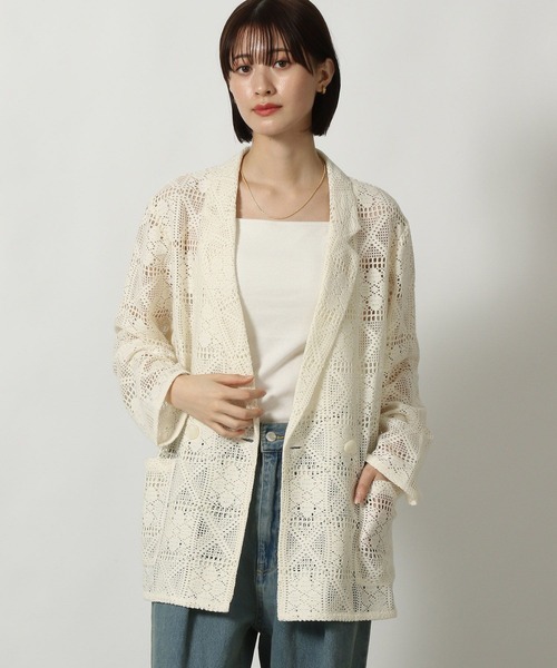 幾何柄レース柄で仕立てたダブル前立てのジャケット。 ビックシルエットなのでリラックス感のある着心地もポイントで、程よい肌見せが叶いスタイリングにヘルシーさをプラスできる1枚です。 レースが繊細な印象で、カジュアルになりすぎず着用いただけます 【素材】 綿混の柔らかな素材感。 【スタイリング】 シンプルスタイリングに合わせるだけでこなれたスタイリングが完成します。 カジュアルなデニムとの相性〇