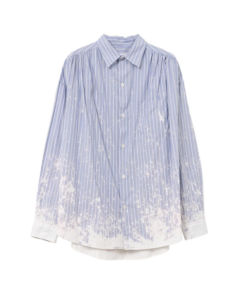 【KAMIYA 2025 Spring/Summer Collection】 ブリーチドストライプロングスリーブシャツ コットンブロードストライプ生地の長袖シャツ。 KAMIYAオリジナルボタンを使用。 胸ポケット。 ファイヤーパターンをイメージさせる脱色加工を手作業で施した。 着用モデル :185 cm 着用サイズ : M