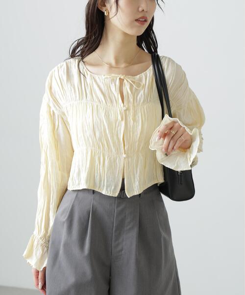 〔fabric&design〕毎年好評のシアーギャザー前開き短丈ブラウスが今年もデザイン変えで登場! 昨年は3段リボンで前開きでしたが今年は一番上だけリボン開きで2段目と3段目はクルミボタンにしています。 袖のシャーリングもなくしシンプルにさらに幅広く着れるデザインにしています。 シャーリングでギャザーがたっぷり入った可愛いカーディガン。 生地の表面感は楊柳のような自然な凹凸があります。 落ち感もありつつふわっとボリュームもあるバランスの良い一枚。若干透けるシアー素材なのでさらっと軽く羽織れるのもうれしいポイント。 〔stylinig〕 程よく甘いデザインなので、あえてデニム合わせでカジュアルなスタイリングがおすすめです。 ワンピースの上に羽織ってボレロのようにコーディネートするのもこなれ感がでて可愛いです。 ■透け感:ややあり ■生地の厚さ:薄手 ■裏地:なし ■伸縮性:なし ■光沢:なし ■シルエット:スタンダード --------------------------------------------------- ◆商品のお気に入り登録◆ お気に入りアイテムの値下げ・再入荷・在庫1点などの通知を受け取ることができます。 ◆ブランドのお気に入り登録◆ 新商品や再入荷、セール、クーポン配布などお得な情報を受け取ることができます。 ---------------------------------------------------