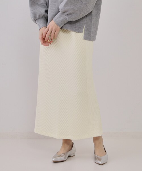 ヘリンボーンキルティング風のふわっとしたカットソーにニットリブ使いが可愛いイージースカート【デザイン】・キルティング風の生地感が特徴的なカットソーのナロースカートです。・同色のニットリブ使いがアクセントになったデザイン。・後ろ裾スリット入り、ウエストぐるりゴム仕様のイージーな穿き心地。・同素材のスカート(637-12230)とセットアップもおすすめです。【素材】・ヘリンボーン柄のキルティングジャカードカットソーとニットリブ素材を使用。・ご家庭の洗濯機でお手入れ簡単なマシンウォッシャブル素材。【仕様】・ポケットなし・ウエスト総ゴム・裏地なし※こちらの商品はやや透け感があるため、インナーの着用をおすすめします。※照明の関係により、実際よりも色味が違って見える場合があります。また、パソコン・スマートフォンなどの環境により、若干製品と画像のカラーが異なる場合もございます。モデル情報:身長167cm B84 W62 H88 着用サイズ:38(M)店舗へのお問い合わせ商品番号:637-72022●製品寸法:38(M):W66~76cm H86cm 総丈84cm40(L):W69~79cm H91cm 総丈85cm42(LL):W72~82cm H96cm 総丈86cm備考: