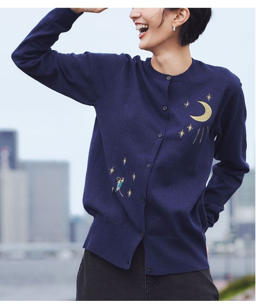 刺しゅうたちに幸運への願いを込めて。ラメ糸や色糸で大小の刺しゅうをほどこし、運気が上がりそうなモチーフをちりばめたスペシャルデザインのカーディガン。ネイビーのニットには夜空に輝く「月」と、幸運を象徴するモチーフと知恵や成功の象徴と言われる「巻き軸」のモチーフも添えて。グレーのニットには勝負事のラッキーモチーフと言われる「勝ち馬」と、夢に向かう力を象徴するような「打ち出の小槌」のモチーフをあしらってポジティブな印象に。着るだけでパワーがもらえそう!プランナーからのコメント―生地の厚さ:ほどよい厚みがあります。―透け感:ありません。―伸縮性:ニットの伸縮性があります。―コメント:胸もととすその刺繍がぐっと着映えるニットカーディガンです。すっきりシルエットだから、はおってもプルオーバーとしても着られるすぐれものです。※フェリシモの商品には、紐などでくくられている紙タグは付属しておりません。