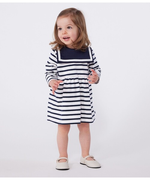 プチバトーを象徴するマリニエールボーダーをあしらった、キュートな長袖ワンピースです。オーガニックコットンを使用した、適度な張りが特徴の平編み素材が快適な着心地を実現しています。セーラーカラーとウエストからの切り替えがデザインのポイント。背面が大きく開くので、外出時などのお着替えやオムツ替えも安心です。これ一枚でフレンチマリンスタイルが叶うおすすめのアイテム。※濃色の製品は、摩擦や洗濯の際に色落ちや色移りをする場合があります。中性洗剤で単独洗いをしてください。