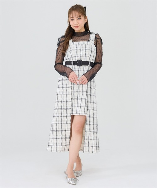 上品で華やかなファンシーツイード生地を使用したジャンパースカート ・ラメ糸入りのファンシーツイード生地で、光に当たるとキラキラして華やかに ・フロントの短くなった裾がデザインポイントで、モード感とカジュアル感をプラス ・ウエストベルト位置を高めに設定しているので、脚長効果も◎ ・ウエストの後ろはゴム仕様で、ウエストをきゅっと絞ってくれます ・左ファスナー 【styling】 ニット、カットソー、シアートップス、とインナーを季節に合わせて変えればロングシーズン着回しが可能です。 --------------------------- 透け感:なし 裏地:あり 伸縮性:なし 生地の厚さ:ふつう --------------------------- M:(02):着丈120.5cm 身幅44.5cm ウエスト71cm S:(01):着丈118cm 身幅43cm ウエスト68cm