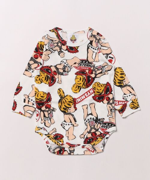 クラシックなMINI DOLLがヒスミニらしいクールさをまとったロンパースになりました☆スタンダードでユニセックスで着ていただける総柄はギフトにもお勧めです♪スタッズ付きのおむつをはいたファンキーなMINIちゃんがなんと言ってもポイント☆かっこかわいいロンパースでお洒落を楽しんじゃおう♪