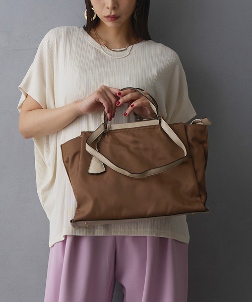 【2WAYトートバッグ大】【Fabric】ナイロンと合成皮革のコンビ使い【Design】本体以外にポケットが5つある収納力抜群の2WAYバッグ。本体のポケットにはファスナーがついているので中身が見えず安心です。手持ちと肩かけができる2WAYタイプで、A4ファイルも収納可能。デイリーに使える便利アイテムです。キーチャームがちょっとしたデザインアクセントに。【Styling】生地とのコンビ素材なのでかっちりしすぎずラフなスタイルにも合わせやすく、ビジカジシーンにも◎シンプルな色合いとデザインなので、お手持ちのスカーフやチャームをつけてアレンジするのもオススメです。☆★お買い物をお楽しみいただく為に★☆★商品のお気に入り登録完売カラーの再入荷通知や、ラスト1点の通知、セールの通知も受け取ることができます。★ブランドのお気に入り登録新商品や再入荷等、ブランドのお得な情報をいち早く受け取ることができます。