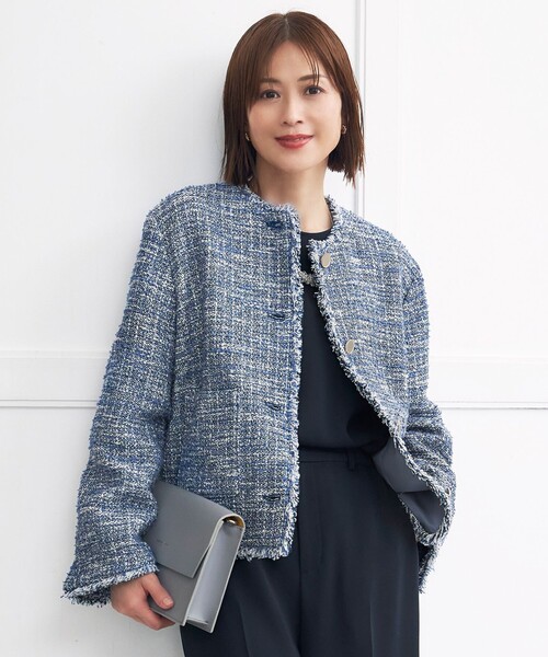 きれいめカラーのファンシーツイードジャケット ■デザイン カーディガンを羽織るようなリラックスしたボクシーシルエットのノーカラージャケットです。肩周りや袖を柔らかく作り、かしこまりすぎないジャケットに仕上げました。襟ぐり、裾、前開き、袖口にフリンジを挟み込みアクセントにしています。別布のグログラン生地を前見返しに使用し、より軽くすっきりとした仕様にしています。ラグジュアリーなコーディネートからカジュアルまでお使い頂けるアイテムです。 ■素材 イタリアの高級ファブリックメーカーGIOLICA社のコレクションの中からピックアップしたツイードです。配色は自由区オリジナルで、ブルー系、ベージュ系の配色を別注しました。ベースには杢糸、ショウセン糸のリボンヤーンがアクセントとなり、ソフトで膨らみがありながらも軽い素材に仕上げています。かしこまった印象になりすぎない、リラックスした雰囲気のツイードで、様々なシーンで着て頂けます。 ※画像はサンプルを使用している為、実際にお届けする商品と仕様、加工、サイズが若干異なる場合がございます。予めご了承ください。 ※撮影環境の都合上、実際の商品と色味が異なって見える場合がございます。 洗濯表示 【本体のみ】洗濯不可 漂白不可 タンブル乾燥不可 アイロンは160℃まで 弱いドライクリーニング可 ウェットクリーニング不可