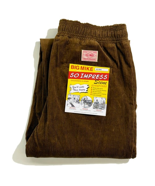 生地開発まで拘った コーデュロイセットアップシリーズ 24秋冬モデルをイージー仕様にアップデート 古着市場でも品薄状態のBIG MIKEの復刻企画となるアイテムです。 季節を穿く、大人の温もり。 見た目はクラシック、履き心地は「極楽」。 BIG MIKEのコーデュロイパンツ。 秋冬の装いに欠かせない、独特の畝(うね)と光沢感を持つ「コーデュロイ素材」。 BIG MIKEが提案するのは、ヴィンテージのような渋い雰囲気を纏いながら、現代のライフスタイルに合わせて快適さを追求した「イージーパンツ」です。 ベルベットのような上品な艶と、空気を纏うような温かさ。 Tシャツやスウェットに合わせるだけで、一気に季節感のある「大人の休日スタイル」が完成します。 【選ばれる3つの理由】 ■ 美しい光沢を放つ「細畝(ほそうね)コーデュロイ」 土臭くなりがちな太い畝ではなく、上品でドレッシーな印象を与える「細畝」を採用。 動くたびに変わる陰影と光沢が、高級感を演出します。 生地自体も柔らかく、ゴワつきがないため、購入したその日から肌に優しく馴染みます。 ■ ストレスフリーな「イージーウエスト」 「お洒落はしたいけど、窮屈なのは嫌だ」 そんな大人の本音に応える、ウエストゴム&ドローコード仕様。 ベルトレスでサッと履けるため、長時間のドライブやデスクワーク、お家でのリラックスタイムにも最適です。 ■ 野暮ったさを消した「美・シルエット」 腰回りと太ももには程よいゆとりを持たせつつ、膝から裾にかけてスッキリと絞ったテーパードライン。 コーデュロイ特有の「重さ」を感じさせないシャープな形は、スニーカーはもちろん、革靴やブーツとも相性抜群です。 【セットアップ対応】 同素材の「コーデュロイ ジャケット(別売り)」と合わせれば、大人の色気が漂うセットアップスタイルが完成。 スーツほど堅苦しくなく、ジャージほどラフすぎない。 デートやディナーにも行ける、秋冬の最強カジュアルセットアップです。 同素材アイテム、 コーデュロイエンジニアジャケット/カーディガン(検索コード 91747233) コーデュロイイージーパンツ(検索コード 91747337) エンジニアジャケット(検索コード 86726895) コーデュロイシャツ(検索コード 86726894) コーデュロイパンツ(検索コード 86726896) とのセットアップが可能になります。 【コーディネート・シーン】 大人の休日スタイルに: カレッジスウェットやパーカーと合わせて。素材の「きちんと感」が、カジュアルコーデを子供っぽくさせません。 きれいめトラッドに: ニットやシャツ、ローファーと合わせて。温かみのある素材感が、知的な雰囲気を醸し出します。 コートスタイルのボトムスに: ロングコートの裾からコーデュロイの質感を覗かせて。のっぺりしがちな冬コーデに、素材のコントラスト(メリハリ)を作ります。 ギフトにも喜んでもらえるアイテムではないでしょうか? 自分へのプレゼントにも。。 キャンプやアウトドアのシーンでも活躍してくれそうなアイテムです。 GO OUT 11月号 掲載ブランド GO OUT 5月号掲載ブランド BIGMIKE ビッグマイク 1980年にアメリカ、イリノイ州で創業したと言われるアメリカンワークブランドBIGMIKE。 日本企画にて現代のトレンドにフィットした、古き良きアメリカンワークウェア。 創業当初よりワークウエアの製造を中心に行い、開発能力も評価されミルスペックの生産も携わっていたと言われている。 1940年代頃からアメリカの多種多様なメーカーが揃いフランネル素材のワークシャツの製造を開始した際、優れた開発能力を有していたBIGMIKEは、耐久性と風合いの良いフランネルシャツを開発。 BIGMIKEのネルシャツは農業や林業のイメージを覆し、建築関係やメカニックまで多種多様なワーカー達に愛用されたブランドと言われている。 1950年代頃には、ワークウエア業界でBIGYANK、BIGMIC、BIGMIKEとで3BIGと言われるまでに成長を遂げたが、1980年代初頭、アメリカ経済の長引く低迷によりBIGMIKEはその生涯に幕を閉じた。 以前は古着で出回っていたが、現在はほとんど姿を消してしまいヴィンテージ市場でも非常に入手困難になっている。 日本企画では、古き良きアメリカンワークウエアのDNAを継承しながらトレンドにフィットする提案をし、別注やコラボレーション企画にも柔軟に対応できる体制を整えている。 古着っぽいブランドでもあり、ミックスコーディネイトにも使いやすいのも特徴。