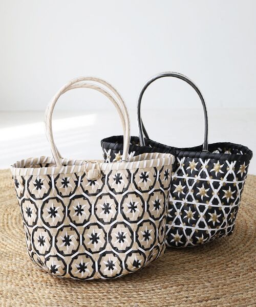 これからの季節にピッタリなシーズンムードたっぷりのトートバッグ。●ポイントお花柄に見えるようカラーテープを編み上げたデザインで、夏のコーディネートにもピッタリ。テープを編んでいるバッグなので本体は軽く、ハンドルは手持ちでも肩掛けでもOKです。