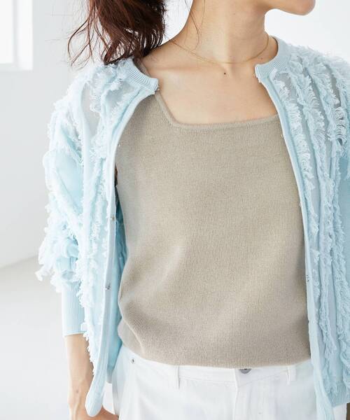 デイリーに使えるニットタンク。今シーズンはシルバーとゴールドのラメ入りが2色新色登場!!程よい開き具合のスクエアタンクでニット素材で楽に着られます。●ポイントスクエアネックは小顔効果やデコルテも綺麗に見せてくれます。●おすすめコーデ羽織りアイテムのインナーとしてはもちろん、1枚着にも対応可能なためロングシーズン活躍が期待できます。