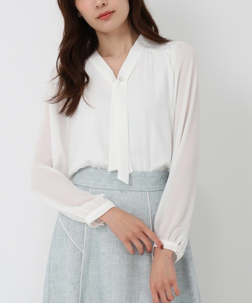 パールバーがアクセントになったエレガントで洗練された印象を与える、ボウタイブラウス。通年人気の裏付きシフォンジョーゼットのお素材です。細身のタイで、付属のパールピンが上品な印象を演出。ギャザーを加えることで柔らかなシルエットを生み出します。仕事やデートなどのきちんと感が欲しいシーンにも活躍してくれる洗練さ漂うアイテムです。☆手洗いOK■fabric透け感[有り]裏地[一部有り]伸縮性[無し]生地の厚さ[薄手]★《お気に入り登録》でお得な情報をGET★・「商品のお気に入り登録」で再入荷通知やラスト1の通知、セールやクーポンの通知も受け取ることができます!→ハートマークをクリック・「ブランドのお気に入り登録」で新商品や再入荷など、お得な情報を受け取ることができます!