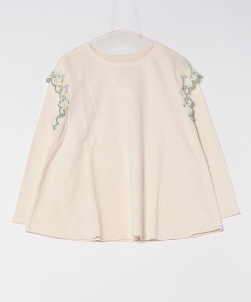 上品なミモザ柄のエンブレースがポイントのシリーズ。肌触りの良いコットン100%のインレイ素材を使用。ほどよい厚みで季節の変わり目や、春先のジャストシーズンにぴったりの仕上がりです。ソフトな雰囲気でレースが映えるアイボリーと、爽やかな杢調サックスの2色展開。25ベアフライスとのクロスコーディネートも楽しめます。肩部分に施された繊細なミモザエンブレースが可愛らしいアクセントになっている長袖トップス。女性らしい上品さと快適な着心地を叶えます。横から見たときのシルエットも魅力的で、動くたびに表情が変わるデザインは、シンプルな中にもこだわりあり。