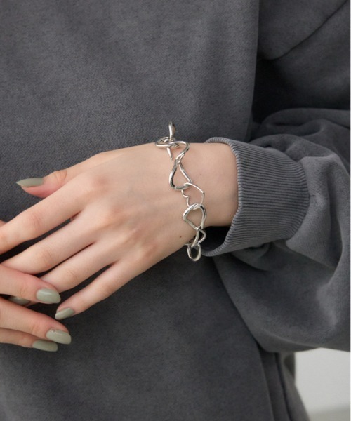 ■ハートチェーンブレスレット ■ポイントハート型のチェーンが連なったデザインで、程よい女性らしさを感じさせつつも、かわいすぎない洗練された印象を与えます。■ディティールシンプルでありながらも存在感のあるハートのモチーフは、どこかクールさも漂い、カジュアルからフォーマルまで幅広いスタイルにマッチします。シルバー、ゴールドの落ち着いたカラーで仕上げられており、上品で洗練された雰囲気が魅力。デイリーユースはもちろん、大人の女性にぴったりなアクセサリーです。■素材金属アクセサリーの場合、消毒液に触れたり、皮脂および汚れの蓄積により、変色や変質する場合がございます。定期的にふき取りのメンテナンスをお願いします。消毒液が製品に直接かかる事が無いようご注意下さい。[注意事項]※画像の商品はサンプルです。実際の商品と仕様、加工が若干異なる場合があります。※画像の商品は光の照射や角度、お使いのモニター環境により、実物と色味が異なる場合がございます。※着用、お取り扱いの際は、アテンションタグをご確認ください。[お気に入り登録のおすすめ]■商品のお気に入り登録お気に入りアイテムの再入荷・在庫1点などの通知を受け取ることができます。■ブランドのお気に入り登録新作アイテムの入荷や人気アイテムの再入荷、おすすめトピックスなど、いち早くブランドの情報を受け取ることができます。※こちらの商品はAZUL BY MOUSSY独自の採寸方法となっています。本サイトのサイズガイドと採寸方法が異なる場合がありますのでご了承ください。