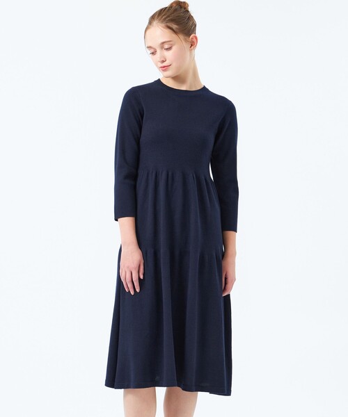 <ニット素材のティアードワンピース> シックな雰囲気のカラーリングと、華やかなティアードディティールを備えたニットワンピース。 手首が少し覗く九分袖ですっきりと着用いただけます。 ニットの編みでギャザーを表現しているので、シンプルでありながら程よく立体感のあるシルエットが魅力です。 【素材】 ウールと合成繊維を混紡する事で、肌あたりが優しく温かみも感じられる素材です。 シルクも加わる事で滑らかな風合いに。 裏側にはストレッチ糸を添えて、軽さと程よいハリ感を表現しています。 おすすめ着用期間:春/秋/冬 ※36サイズはオンラインストア、ジェイアール名古屋タカシマヤ店、阪急うめだ本店、山形屋店のみでのお取扱いになります。 ※この商品はサンプルでの撮影を行っています。 実際の商品とイメージ、仕様が異なる場合がございます。
