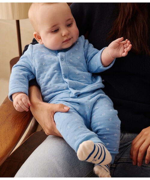 クールなイカリのプリントをあしらったベビー2点セットです。環境にやさしいオーガニックコットン製の2枚の生地を編み上げたやわらかなチュビックキルティング素材を使用。セットアップでの着用から、カーディガンとパンツを別々に着用したコーディネイトまでスタイルの幅を楽しめます。ご自宅での使用はもちろん、キュートなデザインがギフトにも大変喜ばれるおすすめアイテムです。※キルティング素材は、縫い目から中綿が吹き出す場合があります。吹き出した中綿は引っ張らずにハサミで切ってください。また、キルティングの縫い目に力が加わると糸がほつれたり切れたりしてしまう場合がありますので、お取り扱いの際はご注意ください。