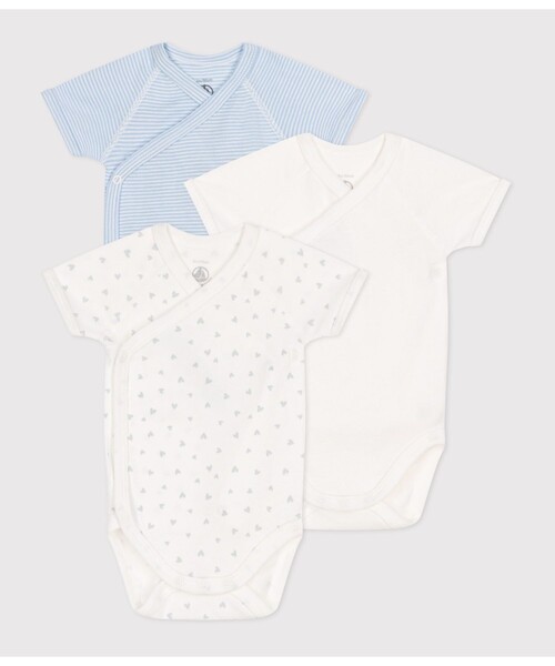 アイコニックなミラレボーダー、人気のハートプリント、清潔感のあるピュアホワイトで揃えた半袖あわせボディ3枚セットです。環境にやさしく、第二の肌と呼ばれるほどやわらかな1x1リブ編みコットン素材を使用し、ナチュラルでやわらかな手触りを実現しています。前面にはスナップボタンが施してあるので、お着替えやオムツ替えも簡単。何枚あっても嬉しいアイテムは、ご自宅での使用はもちろん、ご出産祝いなどのギフトにも大変おすすめです。※濃色の製品は、摩擦や洗濯の際に色落ちや色移りをする場合があります。中性洗剤で単独洗いをしてください。