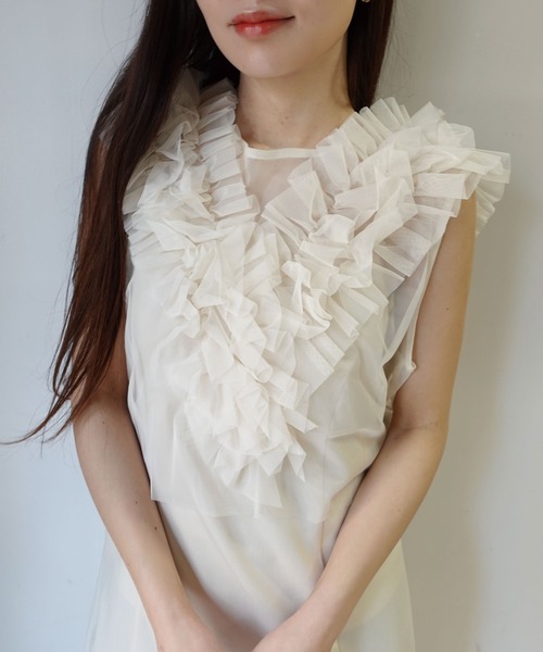 一点投入でコーデが華やかになるチュールフリルベストふんわりと柔らかなチュール素材を使用したチュールベストチュール素材ならではの程良い透け感と、存在感抜群のボリューミーなルックスが魅力的なアイテムです。キャミワンピやサロペットと合わせてオケージョン、二次会などにも◎フリルなどのカットソーと合わせて、ちょっと華やかな普段使いにも!▽生地感透け感:あり ●〇〇〇〇 なし生地の厚さ:厚い 〇〇〇●〇 薄い裏地:なし伸縮性:あり◆商品のお気に入り登録【お気に入りに登録】を是非ご活用ください。 再入荷の通知や、ラスト1点の通知、セールの通知がいち早く届きます。◆ブランドのお気に入り登録新商品や再入荷など、いち早くブランドのお得情報が届きます。◆ATTENTION◆※取り扱いについては、商品についている品質表示でご確認ください。※出来る限り忠実に再現するよう務めておりますが、 ディスプレイ画面などの環境上、店頭・屋外での撮影画像は、光の当たり具合で色味が違って見える場合が あります。ご了承下さい。※こちらの商品は水や雨に濡れたり、汗による湿気、乾燥状態での摩擦により、薄い色の衣服などに 色移りする可能性がございます。予めご了承いただき、ご使用の際にはご注意くださいますようお願い致します。※平置きでの実寸のため若干の誤差が生じる場合がございます。※生産時期により若干の色ブレやサイズの変動が生じる場合がございます。※また製品加工上、お手元に届く際に匂いが生じる場合がありますが、 ご使用を続けていく事により匂いは軽減されます。※輸送時による、多少の汚れ・シワがある場合がございます。 ■海外製品の為、まれにキズや色糸混入、縫製の甘い・雑な商品、サイズにバラつきが見られる場合がございます。予めご理解の上、ご購入下さい。