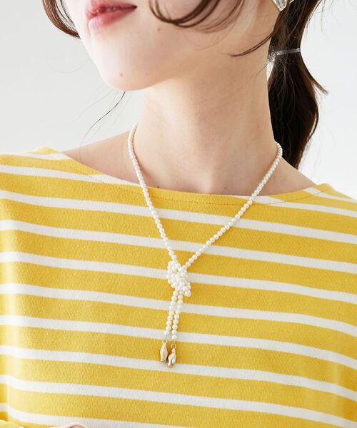 パールの輝きとゴールドのモチーフが華やかなネックレス 自由なアレンジが可能で、その日のスタイリングに合わせて長さや結び方を調整できます。 シンプルなトップスに合わせるだけで、洗練されたアクセントをプラス◎