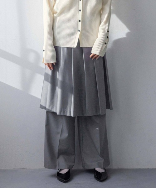 ■素材■ 高級感漂う光沢感があり、サラッとした綺麗な表面で、肌触りの良い素材です。レーヨンが持つ柔らかさとポリエステルのイージーケア性を合わせ持っています。 セットで着こなして頂ける以外にも、パンツ単品でも、別アイテムとプリーツスカートとのレイヤードスタイルでも着こなして頂けます。 ■デザイン■ トレンドのプリーツスカートとフレアパンツがセットになったスカパン。 プリーツスカートは巻き仕様になっています。ジャストウエストでもローウエストでもお好みの位置で着用できます。 パンツはフレアシルエットで後ろウエストがゴム仕様になっていて楽に着ていただけます。 ■スタイリング■ コンパクトなトップスやショート丈のトップスと合わせるとバランスよく着こなせます。 足元はスニーカーでもパンプスでも合わせやすく様々なスタイルが楽しめます。