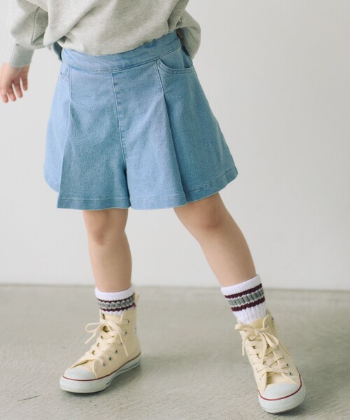 ロングシーズン活躍♪ フレア感が可愛らしいキュロットパンツ ■デザイン タックのフレア感がかわいいキュロットパンツ。 裾幅がやや広く、スカートぽさも感じるデザインで、フェミニンな雰囲気に仕上げました。 ストレッチのきいたデニム素材を使用しているので、動きやすく、アクティブなお子様にもぴったり。 後ろ側はゴムですが、フロント側はゴム無しにすることで、トップスinした時のすっきり見えも嬉しいポイントです。 100cmから160cmまでの幅広いサイズ対応が可能♪ 兄弟姉妹、お友達とペア、リンクコーデ、お揃いコーディネートを楽しめるアイテムです。 ■素材 ストレッチのきいた素材。 ※裾の裏側は、毛羽立ちや、ロックミシンなどの糸始末などに個体差がある場合がございますが、デザイン上、裾側を軽く仕上げる為の仕様、且つ、デニムの加工特性上によるものとしてご理解ください。 ■コーディネート トップスを選ばず着用でき、幅広いシーンで活躍。 スニーカー合わせでカジュアルに、サンダルできれいめにと足元の合わせで印象チェンジが楽しめるのも魅力です。 ============================ 裏地:なし 透け感:なし 伸縮:あり 光沢感:なし 機能性:ストレッチ ケア方法:洗濯機洗い可 ============================ 【注意事項】 ※商品を使用前に、タグ等に記載されている「取り扱い上の注意書き」、「洗濯表示」を必ずご確認ください。 ※商品画像は、光の当たり具合やパソコンなどの閲覧環境により、実際の色味と異なって見える場合がございます。あらかじめご了承ください。 ※商品の色味の目安は、商品単体の画像をご参照ください。 店舗へお問い合わせの際は、全国のgreen label relaxing各店舗まで下記の品名/品番をお申し付けください。 品名:STRC DNM キュロット 品番:38191990774