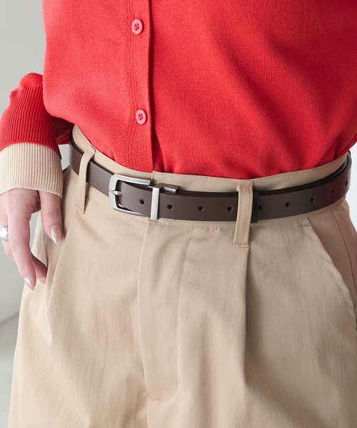 こんなのが欲しかったを叶えてくれる"リバーシブル"ベルト ひとつのベルトで2色の色味を楽しめる! ■POINT・バックルを回すことでベルトの裏表のカラーをどちらも楽しめる ・レザー調の生地を使用した使い勝手抜群のベルト ・シンプルなデザインでプラスワンコーデにおすすめ◎ ・ヴィンテージライクなデザインが、コーデにこなれ感をプラス ・マットな質感のバックルでクラシカルに決まる ・太すぎない幅で、カジュアルにもオフィスシーンにも◎ ■リバーシブル方法 バックル部分を引っ張り、間に空間ができた状態で回すと2wayのカラーをお楽しみいただけます。 また、さる革(ループ)も2色ついており表面のカラーに合わせることができます。 ■カラー展開 ブラック系:ブラック×ブラウン ブラック系1:ブラック×キャメル ブラック系2:ブラック×ライトベージュ ≪お買い物をお楽しみいただくために≫ ▼商品のお気に入り登録 完売カラーの再入荷通知や、ラスト1点の通知、セールの通知も受け取ることができます。 ▼ブランドのお気に入り登録 新商品や再入荷等、いち早くブランドのお得な情報を受け取ることができます。 ※取り扱いについては、商品についている品質表示でご確認ください。