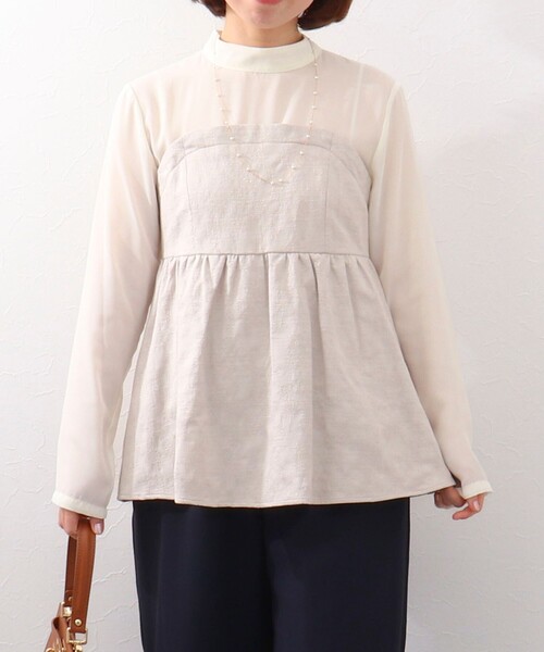 ◇25SS◇MICO COULIER◆Point・1枚でレイヤード見えするトレンドのペプラムトップス・ほんのりシアー感のあるシフォンブラウスにジャガード生地のビスチェをレイヤードしたようなデザインのドッキング1枚着・オシャレに体型カバーしてくれ、気になるお腹周りやヒップラインをカバーしインせず着られるアイテム・ビスチェ部分は華やかで立体感のあるフラワージャガード素材を使用・後ろ身頃にはゴムが入っているので、着脱もしやすい仕様・スタンドカラーのブラウスネック後ろにはパール釦が付き上品なデザイン・セレモニーにも着られる華やかさがあり、1枚でこなれ感のあるスタイリングが完成・パンツはもちろん、タイトスカートと合わせたコーディネートもおすすめ・きれいめにもカジュアルにも着回せる、トレンドスタイルが叶うアイテム----------------------------------------------------------透け感:グレイッシュベージュ:ジョーゼット部分のみややあり、ブラック:ジョーゼット部分のみ若干あり裏地:なし伸縮性:なし光沢感:なし洗濯:手洗い可----------------------------------------------------------●お取扱い上のご注意●末永くご愛用頂くために、アテンションタグを必ずご確認の上、着用又はお取り扱い下さい。気になる商品は、お気に入り登録がオススメです!クーポン情報、入荷情報が、通知されるようになります。※店頭及び屋外での撮影画像は、光の当たり具合で色味が違って見える場合があります。商品の色味は、スタジオ撮影の画像をご参照下さい。※商品画像に関しては出来る限り忠実に表示出来るよう努めておりますが、お客様がご利用のモニターの設定及び特性により、実際の商品と比較し色味に若干の誤差が生じる場合があります。※製品洗い加工の商品は、多少の歪み、シワなどが見られたり、風合いやサイズ等が1枚1枚異なります。汗や雨等で濡れた時や、摩擦により色落ちし、他の衣料を汚すことがありますので(特に濃色のもの)ご注意ください。