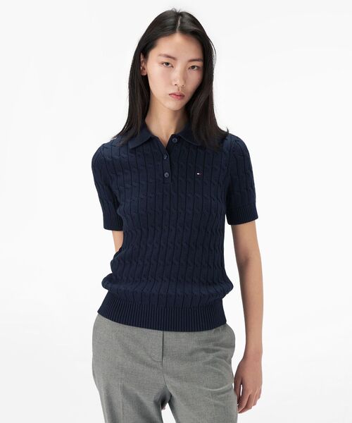 ケーブルポロニットケーブル編みで立体感を持たせた半袖ポロニット。胸元にフラッグロゴをワンポイントとしてあしらっています。袖口、裾をリブ編みにして、シルエットにメリハリを持たせているのも特徴。綿100%生地を使用した、ナチュラルな仕上がりも魅力です。【TOMMY HILFIGER】永遠のアメリカンクラシックをベースにモダンなひねりを加えたデザインが人気のトミーヒルフィガー。都会的で洗練されたメンズ・ウィメンズに加え、チルドレン、ゴルフライン、そしてよりカジュアルなデニムラインと豊富なカテゴリーが揃うグローバルブランド。