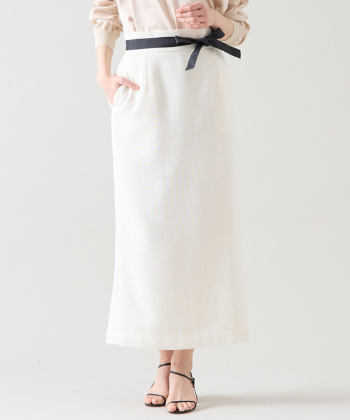 細めのバイカラーリボンがポイントのハイウエストなタイトスカートです。 後ろサイドベンツが足さばきの際にキレイに見えるのがポイントです。 リサイクルポリエステルを原料に使用したリネン見えの素材です。 シワになりにくく吸水速乾性の良い素材です。 ■透け感 ややあり ■伸縮性 なし ■光沢感 なし ■裏地 総裏 ■生地の厚さ やや厚い