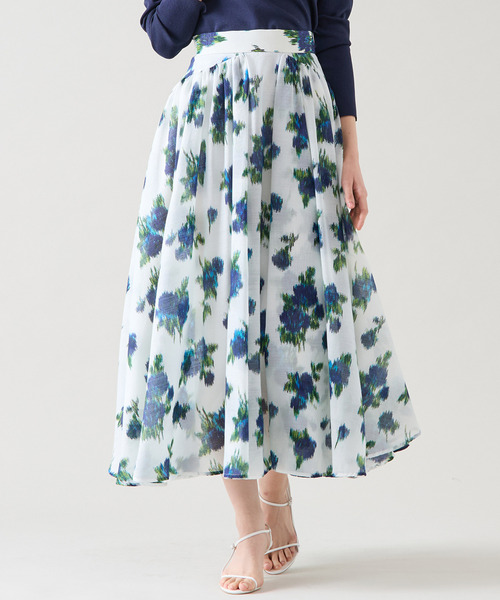 ギャザータックとフレアがたっぷり入ったボリュームスカートです。 後ろウエストに部分ゴムが入っているのでストレスフリーで着用可能です。 薄く軽いポリエステルスパンボイル素材です。 透け感と天然ライクなナチュラルな横フシが特徴の素材です。 オリジナルのほぐしジャガード風の花柄をプリントしています。 ■透け感 あり ■伸縮性 なし ■光沢感 なし ■裏地 総裏 ■生地の厚さ 薄い