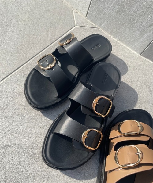 見た目の洗練さと履き心地の良さを兼ね備えたダブルバックル付きベルトサンダル。 スポンジ入りの中敷きで、長時間のお出かけも快適です。 ゴールドカラーのパーツがアクセントとなり、大人っぽいエレガントな雰囲気を醸し出します。 【素材】 マット調合成皮革。 【デザイン】 ダブルベルトで安定感あるフラットサンダル。 【ikkaポイント】 ・フィット感ある2ベルト仕様 ・シャーク底で滑りづらく、デザイン性あり ・バックルを調整しサイズ変更可 ・中敷き下はフカフカスポンジ入り
