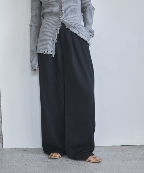 ◆Detail オンオフ兼用で着用可能なイージースラックス。 ややとろみ感のある生地で肌当たりのよい着心地◎ ワイドシルエットですが生地に落ち感があるためスッキリとお召しいただけます。 腰回りはゆとりのあるツータック仕様。 普段使いはもちろんお仕事着などにもおすすめの一本です。 ◆Fabric -------------------------- 透け感:なし 伸縮性:なし 光沢:ややあり 裏地:なし ポケット:あり ウエスト後ろゴム仕様 生地の厚さ:★★★☆☆ -------------------------- ※汗や水、摩擦により他のものに色移りすることがありますのでご注意ください。 ※濃色製品は色移りすることがありますので、他の物と分けて洗濯してください。 ※生産時期によりサイズや質感・色味に若干の個体差がみられる場合がございます。 ※商品画像は、光の当たり具合やパソコンなどの閲覧環境により、実際の色味と異なって見える場合がございます。 予めご了承ください。 ※着用、お取り扱いの際は、商品についている品質表示とアテンションタグを必ずご確認ください。 ◆Information 欲しいitemをお気に入り登録(♡マークをclick) ・お買いのがし対策…完売itemの再入荷やラスト1点の情報をお知らせ ・欲しいitemをお得にget…pricedownになったらいち早くお知らせ ・スムーズ検索…ZOZOのお気に入りアイテムページで簡単checkできるから、再検索不要♪