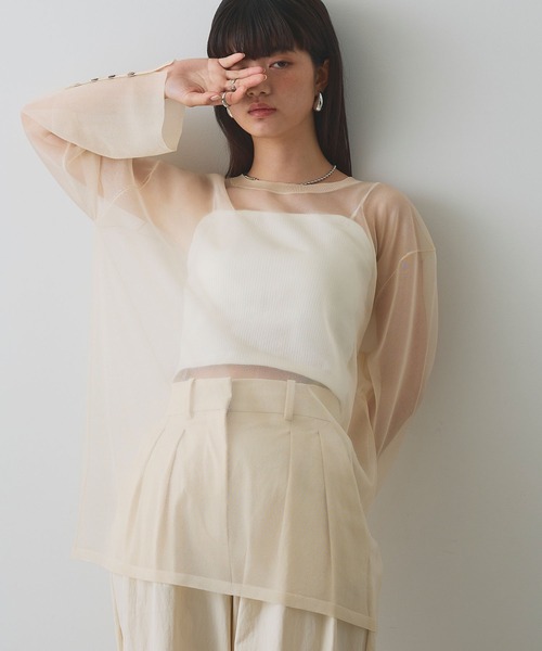 気分高まるツヤ感シアーニット ■Fabric やや光沢のある細番手の糸を使用し繊細なシアー感がたまらないニットチュニック。 透明感のある糸で張り感と艶の素材感で今年らしさ抜群の1着です。 シンプルなデザインの中に袖口のロングカフスがアクセントに。 春気分高まる淡いカラーを含む4色展開。 ※引っ掛かりやすい素材となる為、お取り扱いにご注意ください。 ■Style 程よいリラックス感のあるシルエットなので、インナーにTシャツをレイヤードするのはもちろん、その逆のインナーとしてTシャツの下に着用いただくのもおすすめ◎ シャツ間隔で使用できるデザインに仕上げています。 ------------------------------------- 透け感:あり 伸縮性:ややあり 厚み:薄手 洗濯:手洗い可 -------------------------------------- ※商品の特性上、色落ち・色移りがある場合がございます。品質表示をご確認の上、お取り扱いにはご注意くださいませ。 ※撮影時のライティング、ご覧になっているモニター・PC環境により実際の商品と色味が異なって見える場合がございます。ご了承の上お買い求め下さい。 ※サンプルにて撮影をしている為、色味や仕様、サイズ等に若干の変更がある場合がございます。予めご了承く