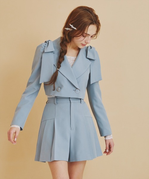 ジャケット、ビスチェ、ショートパンツのセットアップスタイリングがおすすめ!・スカート見えのプリーツデザインのショートパンツ・ビスチェとジャケットとのセットアップで着用を想定して、ほどよくガーリーに着こなせるようにパンツにしました・パンツなので、ミニ丈でも安心・きれいめ見えのツイル素材を使用・柔らかい生地だから、動きやすく着心地も◎・ウエストの後ろはゴム仕様で、トップスINもきれいに着こなせます【styling】同素材のショートテーラードジャケット(商品番号:20022516500025)、リボンショルダービスチェ(商品番号:20022515500026)と合わせるセットアップスタイリングがおすすめ!シアーなハイソックス&厚底シューズでガーリーに着こなして。---------------------------透け感:なし裏地:あり伸縮性:なし生地の厚さ:ふつう---------------------------S:(01):脇丈43cm ウエスト63cm ヒップ96.2cm 股上32cm 股下9cm わたり幅36.3cmM:(02):脇丈45cm ウエスト66cm ヒップ99.2cm 股上33cm 股下10cm わたり幅37.3cm