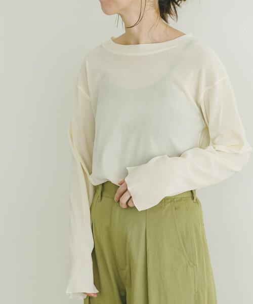 カジュアルなネックラインに、袖や裾をかわいらしいメロウ仕上げでアクセントを加えたカットソートップス。 柔らかく肌になじむベロアの素材感と、ほのかな透け感が特徴で、取り入れるだけでトレンド感を演出します。 存在感はありながらも、シンプルなロンTデザインなのでスウェットやカーディガンのインナーとしても活躍し、シアー素材ならではの軽やかさがあるため、重ね着をしても重たさが出ず、使いやすいのも嬉しいポイント。 カラーは大人っぽい落ち着いた3色を採用し、コーディネートのスパイスになってくれるアイテムです。 【2025 Spring/Summer】【25SS】 ※商品画像は、光の当たり具合やパソコンなどの閲覧環境により、実際の色味と異なって見える場合がございます。予めご了承ください。 ※商品の色味の目安は、商品単体の画像をご参照ください。 ▼お気に入り登録のおすすめ▼ お気に入り登録商品は、マイページにて現在の価格情報や在庫状況の確認が可能です。 お買い物リストの管理に是非ご利用下さい。 素材感 透け感 : ややあり(CHA, MTD)あり(OFF) 伸縮性 : あり 裏地 : なし 光沢 : ややあり ポケット : なし FREE