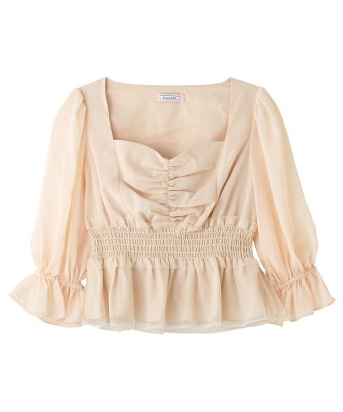 シフォンとチュールの重ね着風。バスト&ウエストにメリハリつけてグッドスタイル。【おすすめポイント】・シフォンとチュールをドッキングした華やかブラウス。・ふんわりギャザーが胸元をふっくらと見せ、ウエストシェイプでぐんとスタイルアップ。・「ボリュームティアードスカート」とのコーディネートもおすすめ。【こんな人、こんな時に】・ロマンティックで夢のあるスタイリングが好き・ボディに女性らしいメリハリをつくりたい【デザイン】・前身頃中央はチュールにギャザーを寄せて、胸元にふっくら立体感をプラス・袖、後ろ身頃、前身頃の左右はシフォンで、ボレロを重ね着したようなルックス・広め&深めにあいたスクエア型のネックがデコルテを美しく見せる・前後身頃に裏生地付きで、透けを防止・手首が出る7分袖。袖口にゴム入りのフリル仕様・ハイウエスト位置にシャーリング入りでフィット。ボディにメリハリを演出・ウエスト切り替えから下はチュールのフレア。腰骨上の丈【素材】・フロント中央や裾の表生地は、透け感が高くソフトなチュール・袖や後ろ身頃などは、ほんのり透け感のあるシフォン・裏生地はポリエステルタフタモデルサイズ:160cm、着用サイズ:ワンサイズ