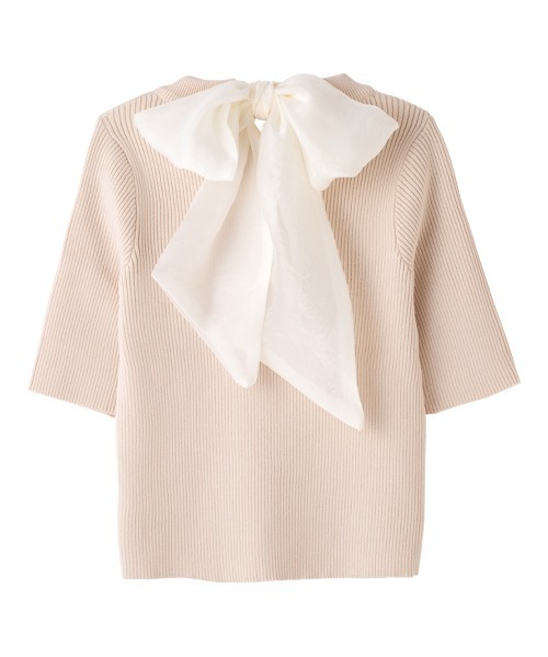 フロントはシンプル、バックは思いっきりスウィート!ギャップで魅せる一枚。【おすすめポイント】・バックに大きなオーガンジーリボンをセット。キュートなサプライズが魅力。・フロントは飾りがなくシンプルなので、コーディネートしやすい。・フィット感のあるリブニットがタテのラインを強調し、ほっそり感を演出。【こんな人、こんな時に】・インパクトのあるキュートなトップスがほしい・シンプルな中に、ひとひねり加えたデザインが好き【デザイン】・ネックラインの後ろ側はスラッシュあきで、オーガンジーの大きなリボンが縫い付けられ、自分で結ぶ仕様。・フロントはラウンドネック・全体にほど良くフィットするシルエット、腰骨上の丈・二の腕をカバーする5分袖【素材】・やや薄手でソフトな、レーヨン混のリブニット・リブ編みの縦ラインの効果で、スレンダーな印象にモデルサイズ:160cm、着用サイズ:ワンサイズ