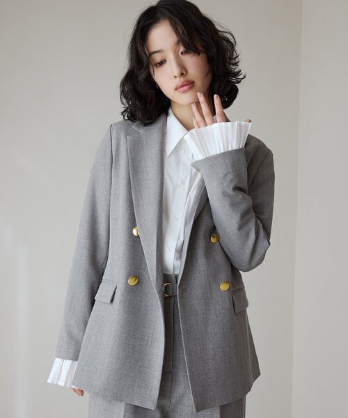 【デザイン】 上品なシャークスキン素材で仕立てられたWブレストジャケットは、洗練された印象を与える一着です。 金ボタン使いが華やかさを添え、フォーマルシーンでも映えるデザイン。 また、カジュアルなスタイルにもマッチし、多様なコーディネートを楽しむことができます。 【素材】 シャークスキン素材は、しっかりとした厚みと滑らかな手触りが特徴。 良質感あふれる仕上がりで、シワになりにくく、長時間の着用でも美しいシルエットをキープします。 この素材は、環境に優しい素材を使用しております。 【着こなしポイント】 このジャケットは、同素材の040-62006(CAVIANベルト付きタックワイドパンツ)とセットアップでの着用が特におすすめ。 全体のコーディネートを意識することで、統一感のあるスタイルが完成します。 シンプルなトップスを合わせることで、洗練された大人のカジュアルスタイルが実現します。 ※照明の関係により、実際よりも色味が違って見える場合があります。また、パソコン・スマートフォンなどの環境により、若干製品と画像のカラーが異なる場合もございます。 ***************************** 【お買い物をよりお楽しみいただくために♪】 \\気になるアイテムはお気に入り登録がおすすめ!// オンラインサイトの商品ページにある『ハートマーク』をタップして簡単に追加できます。 再入荷通知や値下げ情報、在庫状況をメルマガにてお知らせ! マイページにてお気に入り一覧もチェックできます!! ***************************** 店舗へのお問い合わせ商品番号:040-42003 ●製品寸法: 11(S):着丈前64cm 着丈後65cm B97cm 袖丈57cm 肩幅39cm 12(M):着丈前66cm 着丈後66cm B100cm 袖丈58cm 肩幅40cm 13(L):着丈前67cm 着丈後68cm B103cm 袖丈59cm 肩幅41cm 備考: