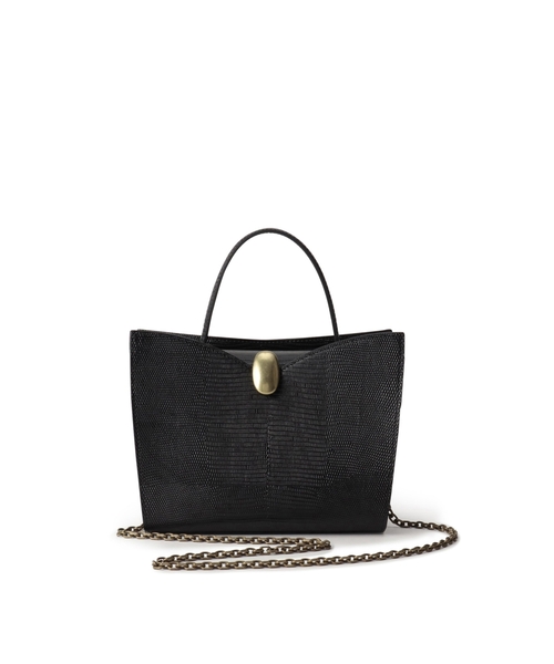 大振りな金具と、チェーンショルダーが特徴的なアクセサリー感覚で持てるノワシリーズ。フランス語で「くるみ」を意味するNoix。端正なボックス型のハンドバッグながら、簡易的な開閉方法でラフにお持ちいただけます。ショルダーには小ぶりのチェーンを使用しており、いつものスタイリングを華やかにアップデート。取り外しも可能なので、ショルダーなしでオケージョンにもお持ちいただけます。リザード型押しレザーは金具をゴールドカラーで合わせており、よりクラシカルな雰囲気に仕上げました。金具カラー:GO(ゴールド)■着脱可能なショルダー付き■ハンドル立ち上がり:9.5cm■外装:底鋲付き、背胴オープンポケット×1■内装:オープンポケット×2、ファスナーポケット×1※照明の関係により、実際よりも色味が違って見える場合があります。また、パソコン・スマートフォンなどの環境により、若干製品と画像のカラーが異なる場合もございます。【お気に入り登録】気になるアイテムは『お気に入り登録』がおすすめです。オンラインサイトの各アイテムにある「ハートマーク」をクリックして簡単に追加できます。お気に入りアイテムが、在庫残りわずか・再入荷などキャンペーン対象になった場合にお知らせいたします。店舗へのお問い合わせ商品番号:R97-81470●製品寸法:00:高さ17cm 幅(上部)23cm 幅(下部)20cm マチ10cm 持ち手上がり9.5cm ショルダー全長102cm備考:重量:約500g(サンプルサイズ)