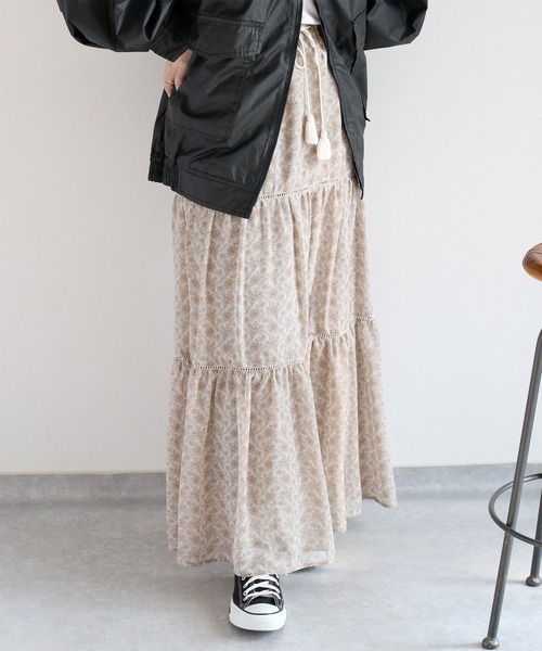 ヴィンテージ風のボタニカルモチーフが華やかに着映えるロングスカート。 ◇Point◇ ヴィンテージのような色合いの生地を使用した、ギャザーたっぷりのティアードスカート。 ウエスト総ゴム仕上げのリラックスした穿き心地も、愛用率を高めてくれるポイントです。 履き心地も見た目以上に軽く、さらっと着用できる1着。ボリューム感のあるシルエット&抜け感のあるデザインです。 たっぷりととった裾まわりで、歩くたびに揺れる足元が着映えポイント♪ ◇Material◇ ポリエステル100%のさらっとした生地感。シワになりずらいので着回しできます。 裏地がひざ下まで付いているので透け感もありません。 ◇Coordinate◇ シンプルな白Tシャツに合わせてもコーデを大人っぽく格上げしてくれるアイテムです。 あえてアウターをGジャンやミリタリージャケットで外すのも、こなれ感が出て素敵です。 コンパクトなトップスのオールインスタイルはもちろん、ゆるっとしたトップスを前だけインしたスタイルも抜け感がでておすすめです。 ※照明や天候により実際の色味と異なって見える場合がございます。ご了承くださいませ。 【キーワード】 #Y2K#20代#30代#40代#50代
