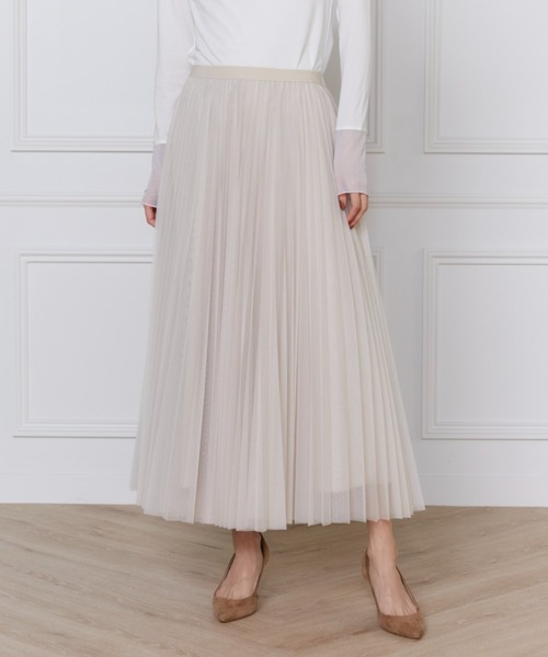 軽やかなチュールのプリーツスカート。細幅のプリーツが上品でシャープな印象です。内側にもチュールを重ねることで程よくボリュームを出しています。ウエストはゴム仕様で穿き心地良く、きれいめからカジュアルまで幅広いスタイリングを楽しめるアイテムです。裏地との境目に透け感があることで軽さが出て、抜け感のある着こなしが完成します。 ・裏地あり ・ウエストゴム仕様 ■サンプル撮影商品■ こちらの商品はサンプルでの撮影となっております。実際の商品とは、サイズや色味、素材、デザイン等の仕様が若干変更になる場合がございます。