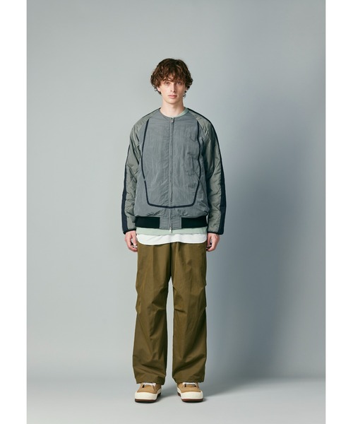 ■ラウンドネックの中綿入りジップアップジャケット。ラウンドネック、袖口のパイピングのアウトドア的なディティール、スカジャンを彷彿とさせる裾リブ、マットな質感の素材使いなど、様々な要素を組み合わせてデザインされたWHIZLIMITEDならではの一着です。表地は高強度かつ弾力性に優れたリップストップ生地を使用。袖は軽量なポリエステル素材のキルティングとなっています。※オリジナルハンガー、カバーが付属します。