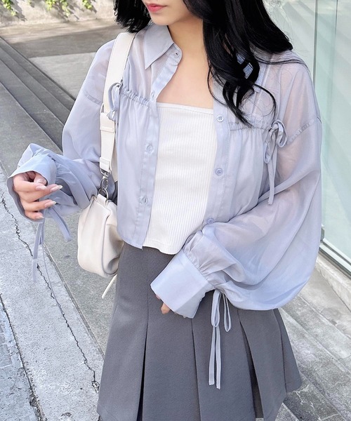 【リボン付きが可愛い!ラメシアーシャツ】 ▼Design ラメ感のある生地と、袖と胸元のリボンデザインで立体感のあるシアーシャツ◎ ふんわりした袖口でフェミニンで上品な印象に◎ ショート丈なので全体のシルエットもスッキリ見えます♩ ▼Styling 夏には清涼感あふれるスタイルに、 Tシャツやキャミソールなどを合わせたレイヤードコーデも楽しめます。 鮮やかに映えるカラー展開が旅行やアウトドアシーンにもぴったりです◎ 【以下ピンク参考。カラーにより多少の誤差あり】 ・透け感:透ける ・伸縮性:なし ・生地の厚さ:薄め ・裏地:なし ▼Recommend ・透け感 ・ヘルシー肌見せ ・リボン ・クロップド丈 ・シャツブラウス ・ブラウス ・ショート丈 ・バンドカラーシャツ
