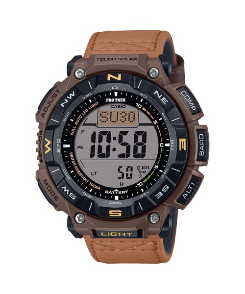 自然を愛する人に向けた本格アウトドアギアPRO TREKより、環境負荷低減への貢献が期待される素材を採用したソーラー搭載モデル「PRG-340」です。アウトドア活動に役立つトリプルセンサー(方位、気圧/高度、温度計測)とタフソーラーを搭載しています。主要パーツにはバイオマス素材を採用しており、PRG-340L-5JFには、落ち着きのあるコヨーテブラウンのカラーリングを採用。合成皮革バンドを纏ったクラシカルなルックスは、アウトドアシーンだけでなく、日常の装いにもマッチします。また、バンドには難燃加工が施されており、調理やキャンプファイアなど火を扱うシーンにも対応可能です。実用性とデザイン性を両立させたモデルに仕上げました。両モデルとも、ベースモデルのPRG-340と同様に、見やすいデュプレックスLCディスプレイを採用。上部の液晶で方位をグラフィック表示し、下部の液晶で時刻や計測値を大きく表示する二層構造の液晶により、視認性が向上しています。薄型化した液晶の採用により、厚みを抑えながらも高機能を実現しました。環境負荷低減への貢献が期待される素材を使用したソーラー搭載モデルPRG-340は、アウトドアでの様々なシーンで対応する高い機能性と実用性を詰め込んだモデルです。・ トリプルセンサー ・ 方位計測機能:16方位・方位の角度(0~359°)を計測、方位連続計測(60秒)、東西南北をグラフィック表示、ベアリングメモリー(方位の角度、記録した方向を示すグラフィックを1本メモリー)、磁気偏角補正機能、方位補正機能 ・ 気圧計測機能(計測範囲:260~1,100hPa)、気圧傾向グラフ表示(過去42時間分を表示)、気圧差グラフィック、気圧傾向インフォメーションアラーム(特徴的な気圧の変化が起こった場合に矢印と報音でお知らせします) ・ 高度計測機能/相対高度計(計測範囲:-700~10,000m)、高度メモリー(計測月日・時刻・高度を最大30本マニュアルメモリー、自動記録データ:最高/最低高度、オート積算(上昇/下降)メモリー)、登山記録データ14本(最高/最低高度、オート積算(上昇/下降)メモリー)、高度差計測(-3,000~3,000m)、計測間隔設定機能(5秒/2分毎)※最初の3分間のみ1秒毎 ・ 温度計測機能(計測範囲:-10~60℃)・ タフソーラー(ソーラー充電システム) ・ 10気圧防水機能・ デュプレックスLCディスプレイ・ ワールドタイム:世界48都市(31タイムゾーン、サマータイム設定機能付き)+UTC(協定世界時)の時刻表示・ 日の出・日の入時刻表示・ ストップウオッチ(1/10秒、1000時間計、スプリット付き)・ タイマー(セット単位:1分、最大セット:24時間、1秒単位で計測)・ 時刻アラーム5本(1本のみスヌーズ機能付き)・時報・ バッテリーインジケーター表示・ パワーセービング機能(暗所では一定時間が経過すると表示を消して節電します)・ フルオートカレンダー・ 12/24時間制表示切替・ 耐低温仕様(-10℃)・ 操作音ON/OFF切替機能 ・ LEDバックライト(フルオートライト、スーパーイルミネーター、残照機能、残照時間切替(1.5秒/3秒)付き)・ LED:ホワイト・ ケース・ベゼル材質: 樹脂(バイオマスプラスチック)・ 合成皮革バンド:難燃加工・ ケースサイズ(縦×横×厚さ):54.7×51.7×15.1mm・ 質量:52g付属品:保管箱【メーカー保証について】保証期間は、お客様のお買い上げ日より1年間です。保証対象は時計本体のみで電池やバンドなどの消耗品は対象外となります。詳しくは、メーカーホームページもしくは取扱説明書(保証書付き)をご確認くださいJANコード:4549526396830
