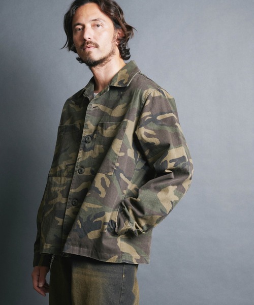 コットン100%で柔らかく、着心地の良い素材感のジャケット 丈夫でへたりにくいので、春秋の軽アウターとしてもおすすめです。 オープンカラーで首周りがすっきりとした印象のジャケット、 目を惹く柄がアクセントとなりバイオウォッシュ加工されておりユーズド感があるデザインに仕上がっています。