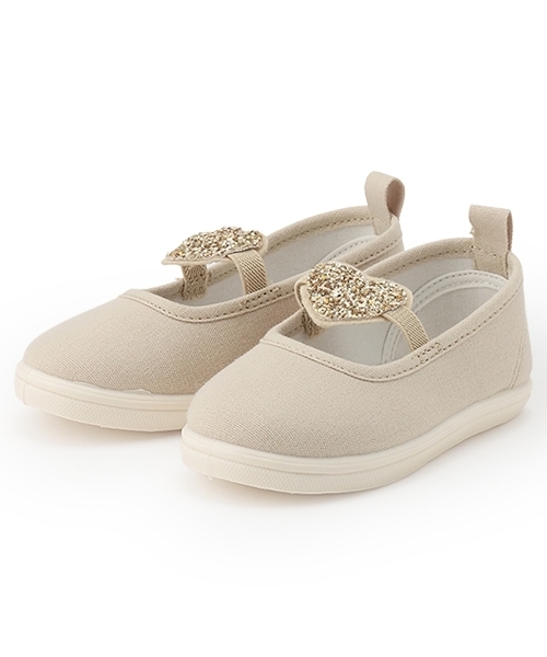 ハートのキラキラモチーフが目を引くシューズです。どんなコーディネートにも合わせやすい、キャンバス風の生地を使用しました。かかとにストラップをほどこしており、脱ぎはきしやすいのもうれしいポイント。凸凹としたソールなので、天候の悪い日にも安心です。