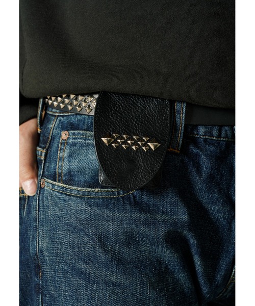 シボ感あるレザーにスタッズワークを施して作製されたコインケース。レザーは使い込む程にシボが消え、艶感ある経年変化を楽しむ事が出来る。背面にはカードが収納可能。