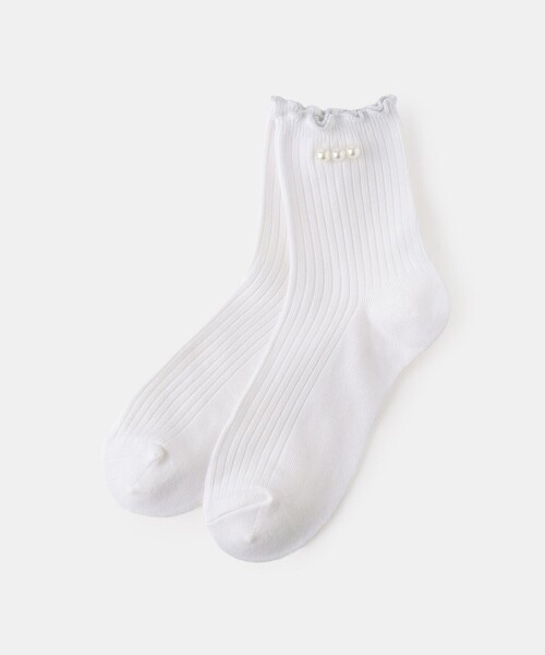 パールがポイント!使いやすいシンプル靴下【素材感】 ・柔らかく伸びの良い素材で、快適な履き心地を実現。 【デザイン・シルエット】 ・サイドのパールと履き口のフリルデザインがポイント。 【カラー】 ・使いやすいホワイトの1色展開。 【スタイリングポイント】 ・発表会や入学式、卒業式など特別な日にもぴったり。 ・通学の普段使いにもおすすめ。 ※撮影時の光、お使いのモニター環境によって色の見え方が違う場合がございます。