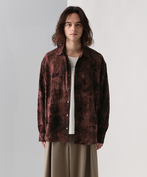 ーーー ムラ染めした生地にフロッキープリントを重ねたデザインシャツ ーーー point □生地をムラ染めし、上からフロッキープリントを重ねたデザイン。 □レトロなフラワー柄を使用しており、モードな印象に。 □伸縮性のある生地で着心地抜群です。 □ゆったりとしたサイズ感でインナーとしても羽織としても着用しやすくて〇
