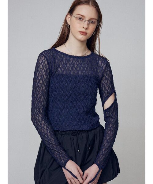 カッティングデザインが目を引くレーストップス ■デザイン 腕に入っているカッティングデザインはアシンメトリーに斜めに入っています。 袖口から紐をつけて指に引っ掛ける様にして着用して頂くのがお勧めです。 レースで甘めな印象ですが、エッジを効かせたモードなデザインに仕上げています。 ■スタイリング カットオフジャストウエストジーンズやカーゴラップショートパンツのようなデニムアイテムとのスタイリングがオススメです。 また、デニムウォッシュベストやカーブレースアップデニムビスチェのインナーに着用していただくとトレンド感のある印象になります。 ※着用画像はフラッシュの加減で実際の製品と色味等が異なる場合がございますので、生地のズームアップ画像をご確認ください。 ※ご利用の端末画面の設定により実際の商品と色味が異なる場合がございます。 【商品特徴】 透け感:あり 伸縮性:なし 生地の厚さ:薄手 サイズ感:細身 裏地:なし ポケット:なし