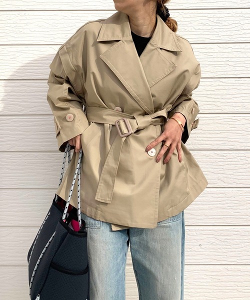袖が取り外しできる2wayショートトレンチです。袖山にはファスナーが付いており、取り外し可能な仕様になっています。袖を取り外して、ジレとしてもお使いいただけます。定番のロングタイプのトレンチコートとは違い、ワンピースやボリュームのあるボトムスにも合わせやすい程よいゆとり感のショートシルエットに仕上げました。座ってもシワが気になりにくく、通勤や自転車・車移動の方にもおすすめの一着です。※裏地は付いていません《インフォメーション》◆商品のお気に入り登録完売していても再入荷時に再入荷通知を受け取ることができますので、是非ご登録ください。◆ブランドのお気に入り登録新商品や再入荷などの情報を受け取ることができますので、是非ご登録ください。